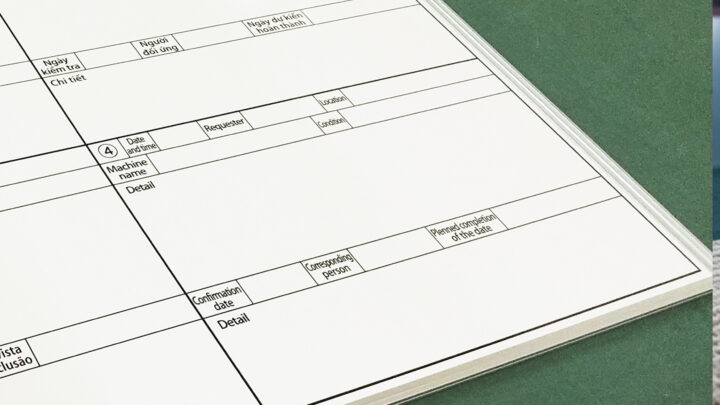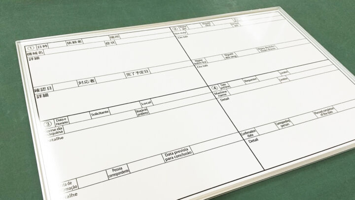製造工場施設内に配置されているホワイトボードに海外からのスタッフでも読めるように、日本語以外での文字入りで