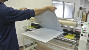 印刷表面にフィルムをはり、印刷面を保護します。フィルムの性質によりマーカー、チョークで書き消しできるようにしたり、屋外環境に耐えれる素材の物も短期用から長期用(3〜5年)の物まで幅広く扱っています。ゴミが入ると不良品となってしまうので、シャンプーキャップは必須です。
