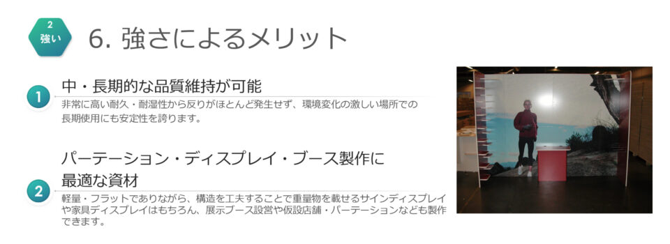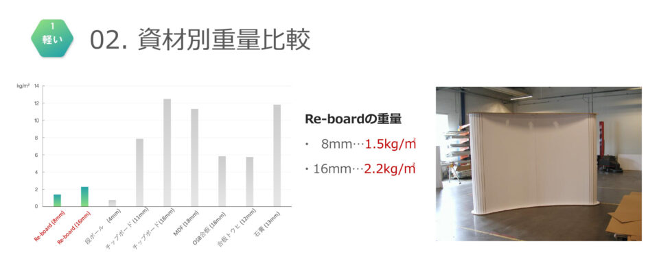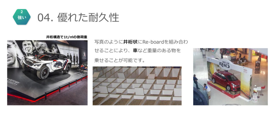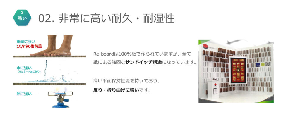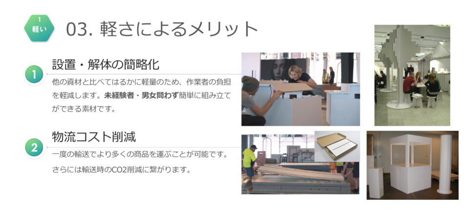 形状変化、劣化を起しにくく安心して使用いただけます。リボードはSDGs認証取得済、FSC®認証製品で環境に優しい素材を使用することでブランドイメージアップを演出できます。使用後は破棄ではなく紙リサイクルに出すことができるため、廃棄のためのコスト削減だけではなく環境の面からも非常に有効でありリボードならではの軽さを生かし女性でも簡単に持ち運び組み立てが容易です。自社で施工おこなうことでコストを抑える事もでき、組み立て前の発送によって運送費も抑える事もできます。